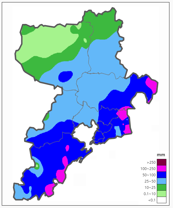 7月2日00時至12時,我市大部地區出現大雨到暴雨,西海岸、嶗山、即墨局部出現大暴雨,全市平均降水量45.3毫米。各區市平均降水量分別為:嶗山77.4毫米,西海岸75.9毫米,市區67.4毫米,城陽61.2毫米,即墨56.5毫米,膠州50.4毫米,萊西26.1毫米,平度16.4毫米。