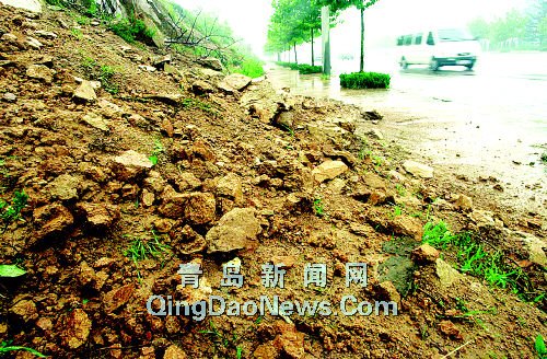 sp; 昨日上午11時許,記者趕到遼陽西路與勁松三路路口附近看到,浮山坡下一處10多米的人行道被塌倒的沙石全部蓋住(上圖),山上流下3米多寬的水流夾著沙石形成泥石流,不斷涌到路邊。記者沿遼陽西路向東走了近2公里發現,沿路山坡有七處這樣的塌方和泥石流缺口。據嶗山環衛人員介紹,因浮山北坡植被較少,遇到連續降雨,山上的雨水就夾帶著泥沙沖下山坡,將路邊的山體沖倒。相關部門調集近百人集中清理堵在人行道上的沙石,至下午3時許,環衛工人共清理路面上的石塊和泥沙近百噸。記者趙健鵬攝影報道     |