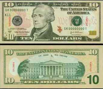 據(jù)美聯(lián)社報道,新版10美元紙幣一改原來綠墨兩色單調(diào)沉悶的風格,增添了紅黃橙三種色調(diào),并提高了防偽技術含量。自從彩色版20美元和50美元紙幣在2003年和2004年先后問世以來,這是美國財政部第三次給美元紙幣“添彩”。從2006年年初起,總額8億美元的新版10美元紙幣將開始進入流通領域。