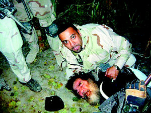 2004年1月,一張從美國軍事網站上流傳出來的照片通過互聯網迅速傳遍了全世界。照片上伊拉克前總統薩達姆·侯賽因被五花大綁反倒在地上,嘴角掛著鮮血,滿臉的驚恐。在他身邊圍著一群美軍特種部隊士兵,其中一人蹲在薩達姆身后,兩眼直勾勾地盯著相機鏡頭。得意的表情暴露出,他內心中充滿的不僅僅是成功完成任務后的狂喜。