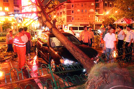2005年10月2日晚,泉州市涂門街附近,一棵約30公分粗的大樹被大風刮倒,正好壓在了停在大樹下的“尼