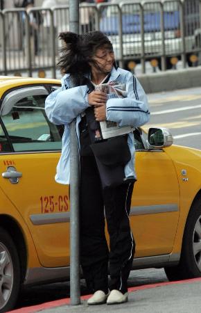 10月2日,一位行人在中國臺灣省臺北市的火車站抱著一根鐵柱,以防被風吹走。今年19號臺風“龍王”于當天襲擊了臺灣省。(來源:新華網) |
