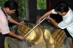 昨晚7時(shí),記者趕到成都藝術(shù)中心時(shí),現(xiàn)場(chǎng)已被玉米和盒飯圍得水瀉不通。雖然本次演出不售票,但神通廣大的黃牛們還是搞到門票以50元左右的價(jià)格賣給歌迷們。7時(shí)30分,演出開始。由于李宇春和何潔被安排在最后兩位出場(chǎng),因此音樂會(huì)前半段的演出被一位女觀眾戲言為:索然無味。昨晚演出的第一個(gè)小高潮由李宇春的好友林麗掀起,雖然是一名落選超女,但憑借扎實(shí)的基本功,林麗以一曲難度極高的《死了都要愛》贏得了觀眾的陣陣掌聲。9時(shí)30分,當(dāng)何潔以一身黑色公主裝出場(chǎng)時(shí),現(xiàn)場(chǎng)氣氛瘋狂到極點(diǎn)。緊接著出場(chǎng)的李宇春更是掀起了昨晚的追星狂潮,黑色外套,白色的長(zhǎng)褲,李宇春的打扮帥氣十足,一個(gè)眨眼一個(gè)微笑都令臺(tái)下觀眾瘋狂尖叫,當(dāng)春春唱起在全國(guó)總決賽時(shí)最拿手的《砰砰砰》時(shí),現(xiàn)場(chǎng)觀眾竟全體起立為其打拍子。在20分鐘的演出中,兩位超女為觀眾獻(xiàn)上了各自的兩首拿手歌曲。不過,與以往大家在電視中看見活力四射、快樂至上的李宇春和何潔相比,昨晚亮相的兩位超女帶給大家的是憔悴的面容、疲憊的身體,甚至在唱高音時(shí)的有氣無力。
