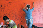 昨日,沙坪壩烈士墓一餐館內,一學生正在橘色的墻上涂鴉。記者 任琦 攝