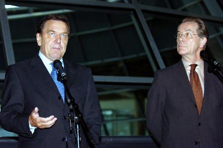 10月5日,在德國首都柏林,德國總理施羅德(左)和社民黨主席明特費林與媒體見面。