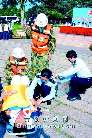 昨天,市旅游局、衛生局和安監局聯合舉辦的旅游突發公共事件應急演練在小青島公園舉行。這次活動以旅游團隊食物中毒三級突發公共事件為情況設定,導游、游客和衛生系 統工作人員迅速展開救援行動。傅學軍攝