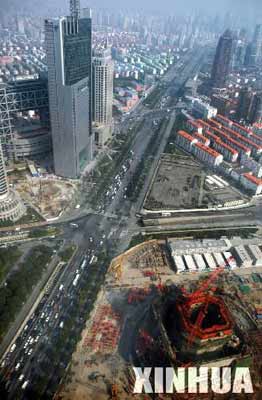 10月18日從空中俯瞰上海環球金融中心建筑工地,正在施工的建筑(右下角)已有6層樓高。