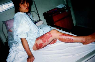 由于羅否認(rèn)有盜竊行為,陳鵬飛用手打了羅兩耳光,接著陳、鄭、黃、劉先后持一根電話線纏成的鞭子對(duì)羅水秀進(jìn)行抽打(多名案犯在昨日的庭審中稱,這場(chǎng)鞭打至少持續(xù)了半個(gè)小時(shí))。