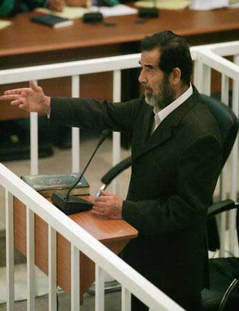 薩達姆:他們連一支筆或一張紙都不給我,或許因為現在紙張是很可怕的東西。我并不是針對你們。不過為了維護正義、以及那些選我(做總統)的偉大伊拉克人,我拒絕回答這個法庭的問話,我保留憲法賦予我作為伊拉克總統的權利。你們很清楚這一點。