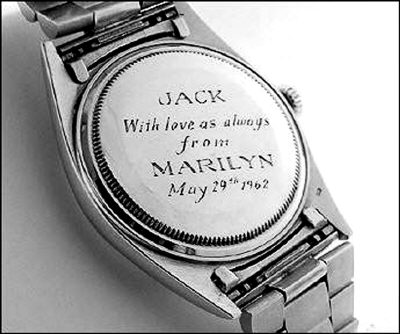 據悉,這塊秘密的“定情禮物”———勞力士金表是美國影星瑪麗蓮·夢露在1962年5月份肯尼迪總統45歲生日期間贈送給他的,肯尼迪出生于1917年5月29日,這塊勞力士金表顯然是夢露專門為肯尼迪定制的,表背上鐫刻著幾行字:“杰克:瑪麗蓮永遠愛你。1962年5月29日”。裝表的金盒上印著兩只鴿子親吻的圖像,盒中一張圓紙片上還寫著一首名為《在你生日之際,提出我真心的請求》的情詩,詩的結尾寫道:“讓我愛你,否則讓我去死!”