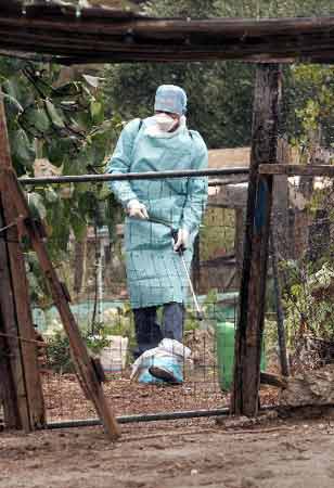 10月18日,在位于愛琴海東部的一座希臘小島上,一名希臘衛生人員身穿防護服,在一家小型農場內消毒。歐盟成員國希臘17日宣布在該農場發現首例禽流感病