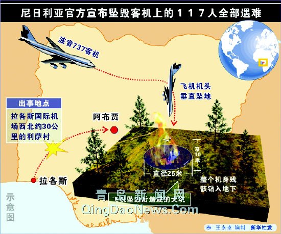 扭曲的金屬,破損的行李,殘缺的肢體。在經(jīng)歷了一系列混亂與謠言之后,尼日利亞貝爾菲尤航空公司一架失事波音737客機的殘骸23日終于被找到。當局說,從現(xiàn)場情況看,機上的117人已經(jīng)全部遇難。    現(xiàn)場沒有發(fā)現(xiàn)任何幸存者