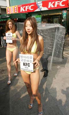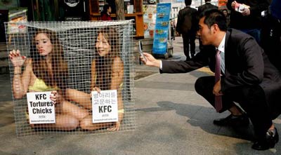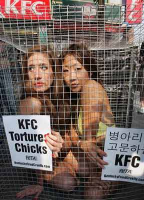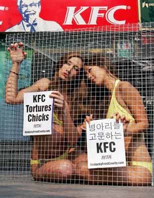 當地時間10月24日,韓國首都首爾的一家肯德基快餐店門前,"PETA"(人道對待動物協會)的兩名成員舉行示威行動,抗議肯德基飼養和宰殺小雞的方式。