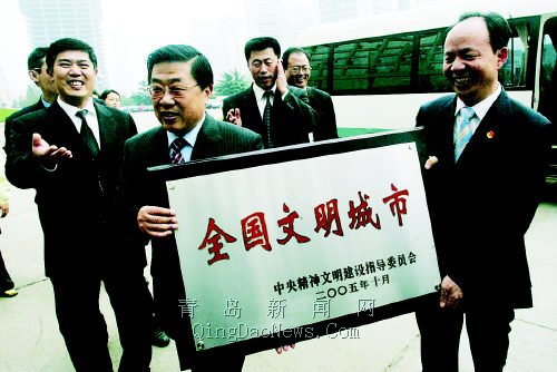 昨日上午,市領導崔錫柱、蔡倫斌在市政府門前迎接“全國文明城市”獎牌徐崇德攝“文明城市”獎牌到青    <<見2版