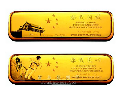 日前,國家博物館宣布,為慶祝神舟六號飛船成功升空及凱旋歸來,國博決定發行1000套神舟六號紀念金條。    每套紀念金條由兩根各為100克的金條 組成,其售價為3.2萬元。邵燕輝攝