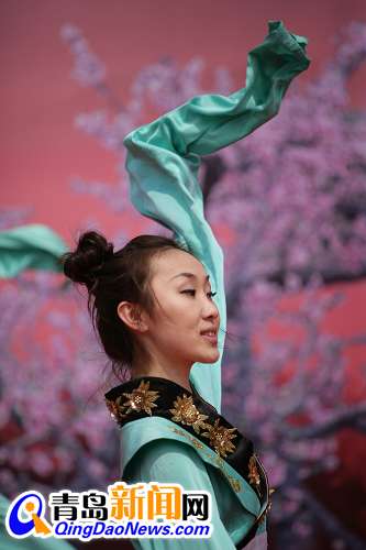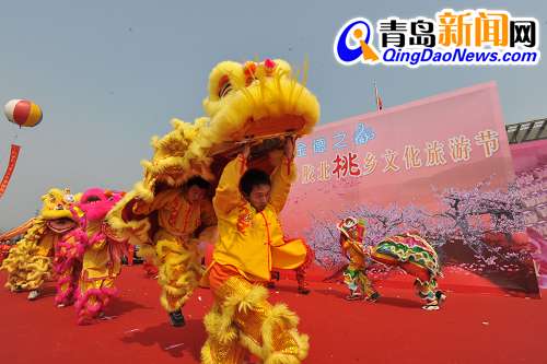 膠州14屆桃花節(jié)開幕式現(xiàn)場舞獅表演 開幕式現(xiàn)場的桃花仙子