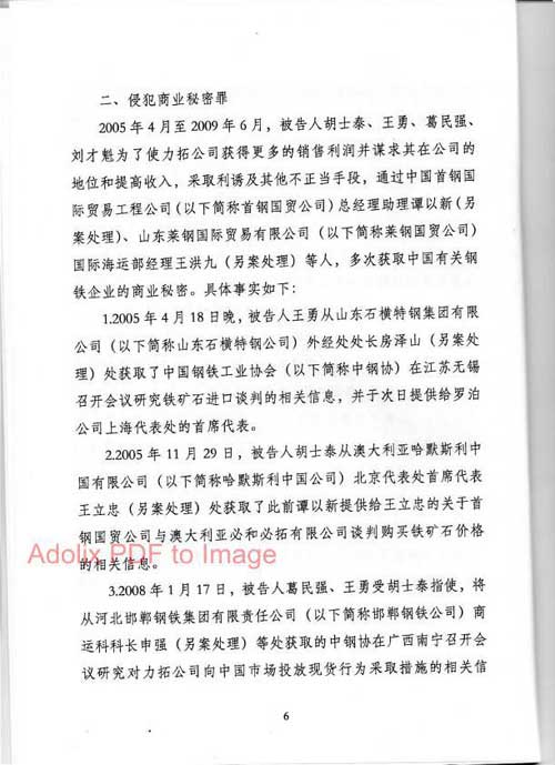 ????判決書顯示,除已宣布的力拓涉案四名員工外,還有澳大利亞哈默斯利中國有限公司(屬于力拓集團)北京首席代表王立忠、力拓新加坡公司上海代表處銷售總監李德也涉嫌竊取相關機密。上述提及人士,以及其他中國鋼廠和貿易商行賄者,判決書絕大部分以“另案處理”標注。