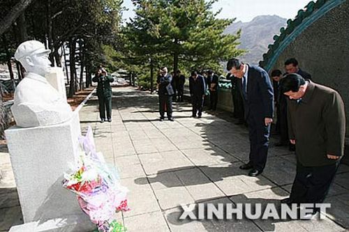 ????中國志愿軍英模烈屬代表團向志愿軍英雄銅像敬獻了花圈,劉松林以烈士親屬名義向位于烈士陵園內的毛岸英烈士墓敬獻了花圈,朝鮮人民武力部及檜倉郡黨政機構也敬獻了花圈。軍事科學院戰略研究部副部長毛新宇大校在毛岸英墓前致祭文,然后將祭文焚燒。