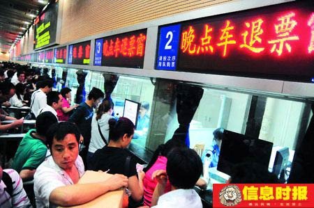 京廣線韶關段發生泥石流 45列車晚點3小時。圖為廣州火車站加開到10個退票窗口,供旅客退票。陸明杰 攝