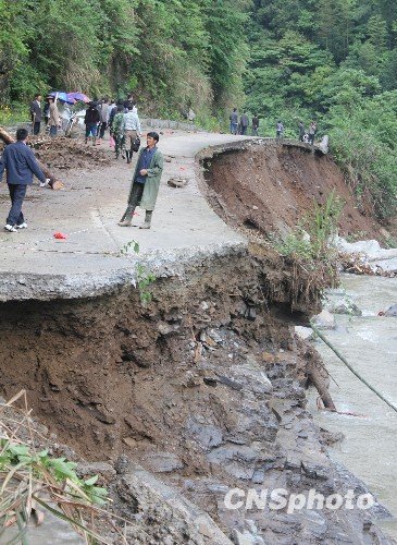 ?5月8日,搶險人員在湖南省婁底市新化縣奉家鎮(zhèn)對被洪水沖毀的公路進行搶修。強降雨近日頻襲湖南,目前強降雨已致湖南省婁底、懷化、衡陽、株洲、湘潭、邵陽、郴州7市169萬人受災(zāi),13人因災(zāi)死亡或失蹤,緊急轉(zhuǎn)移人口28597人,倒房6114間,造成直接經(jīng)濟損失13.63億元。 中新社發(fā) 郭國權(quán) 攝