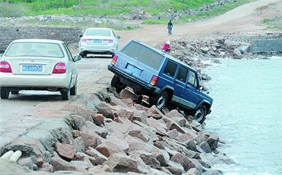 ????“現在海水已經退潮了,我這輛吉普車才從水里露了出來,剛才海水幾乎跟大壩持平,風浪特別大,根本沒法營救。”記者在現場找到了吉普車司機楊師傅,他告訴記者,幸好當時他車速不快,沖下大壩時,前后車輪分別被大石塊擋住,他坐在車里很長時間沒敢動,生怕車輛失去平衡再次滾落。“當時吉普車被大浪拍打得不停地搖晃,我趁著海浪比較平靜時打開車門跳了出來?!睏顜煾嫡f,他已聯系保險公司前來理賠。