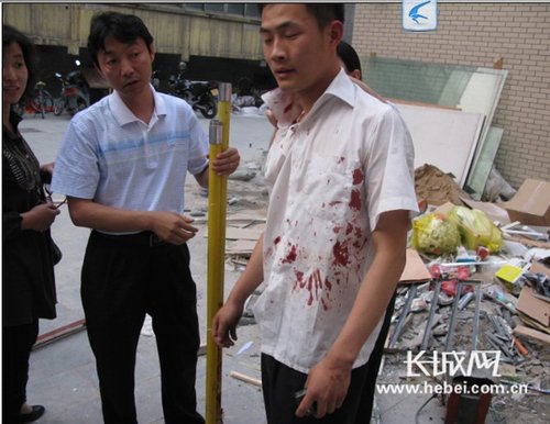 ????邢臺市商業銀行橋東支行保衛科長張平偉在接受記者采訪時說,因橋東支行需要外立面裝修,去年已得到城管部門批準,今年要稍微改動,在報批時,城管審批部門解釋,不再重新審批,原審批有效。今日銀行在施工時,3名城管人員不說明原因就拿走施工工具,于是雙方發生爭執。隨后,城管隊召集來20多名城管人員帶著棍棒,上來就打,從大街一直打到銀行院內,有的城管拿著前頭綁著剪刀的棍子向銀行職員頭上刺。銀行3名職員頭部受傷,一名職員眼睛受傷。