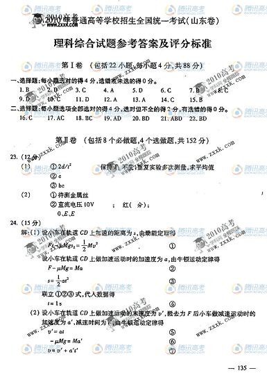 2010年高考數(shù)學(xué)試題答案公布(山東卷)