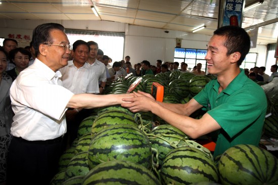 溫家寶在北京市西城區(qū)富國里菜市場了解蔬菜瓜果供應(yīng)和價格情況(新華社記者 姚大偉 攝)