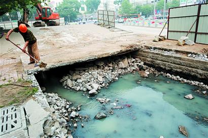 ????砸開水泥板露出臭河
