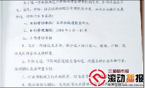 ????在石潭鎮政府,記者看到了一份3頁紙的《目標責任狀》。這是今年1月,石潭鎮政府以該鎮城鎮建設委員會的名義,與石潭鎮城建監察中隊簽訂的。最后一頁,蓋有石潭鎮政府和石潭鎮城建站的公章,并有張議的簽名。《目標責任狀》規定,石潭鎮城區的車輛停靠、環衛有償服務費,由石潭鎮城建監察中隊征收,但必須按縣物價局核定的范圍和標準收取。2010年內,上交鎮城建站經濟任務7.3萬元。城建監察中隊人員的工資、福利、辦公經費等一切費用,由監察中隊自行負責。《目標責任狀》還規定:目標責任期內,石潭鎮城建監察中隊必須按期如數完成經濟目標任務。否則,將扣除監察中隊的工作保證金,并追究責任。