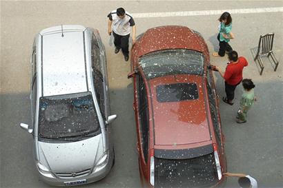 ????記者在現場看到,停在鄆城北路西側的一排汽車上都散落著水泥點子,其中一名越野車的女車主正心疼地擦拭著車身,她告訴記者,半空中掉落的石子砸壞了越野車的后車燈,還把天窗砸了個大窟窿。“我買這車花了14萬元,剛開了兩個半月,有3塊車玻璃被砸碎,車頂也被砸得凹陷,就是修好了也變成舊車了。”越野車旁邊的紅色福特轎車司機郁悶地說。