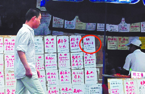 ????對于沈陽路勞務(wù)市場公開張貼此類非法廣告,記者在現(xiàn)場采訪時得知,沈陽路勞務(wù)市場有多達(dá)幾十個攤位代理招工廣告,一則 A4紙大小的廣告,張貼在廣告牌上,一天只需要一元錢?!笆裁礃拥膹V告都可以,只要給錢就可以貼。”記者以用工方身份在現(xiàn)場咨詢時,有代理招工廣告的攤主告訴記者,如果長期張貼廣告,還可以享受一定的優(yōu)惠,至于廣告具體的內(nèi)容以及招工方的具體信息,他們并不會過問。