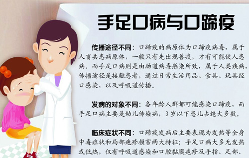 ????針對一些家長將手足口病與口蹄疫相混淆的問題,市疾控中心專門提醒,手足口病與口蹄疫是截然不同的兩種傳染病,傳染源、傳播途徑、發病人群、癥狀體征等都不相同,切不可混淆。