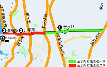 ????打通后的金水路由現狀的金水路、升平路、滄海路組成,沿途分別與環膠洲灣高速公路、安順路、膠濟鐵路、四流中路、永平路、重慶路、黑龍江路、青銀高速公路、濱海大道等道路相交,橫貫李滄區中部區域,是連接李滄區東、中、西部的東西軸線,也是連接青島火車北站和2014年世園會的重要交通要道。隨著青島火車北站的規劃建設,將會誘發該區域交通量的極大增長,而目前區域內路網不完善,南北車輛只能通過環灣大道、東西車輛只能通過太原路進出火車站,因此迫切需要貫通東西向主干路,以滿足交通量的不斷增長。