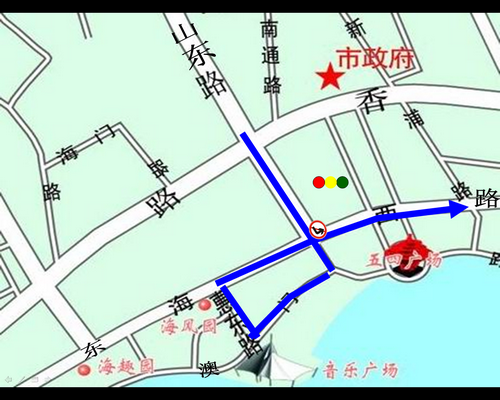 ??? 征求具體方案是:沿山東路北向南行駛至東海路機動車,禁止由山東路左轉駛入東海路,需左轉車輛可直行通過路口,沿香洲路、澳門路、惠東路呈環形駛入東海路,這種措施可以減少路口的交通沖突點,解決因左轉車輛滯留而影響其它方向車輛行駛的問題,從而提高路口單位時間內的通行量。