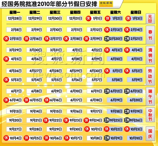 ????9月17日上班,18日休息,19~21日上班,22~24日休息,25~30上班,10月1~7日休息,8~9日上班,10日又休息……暑假過半,不少市民開始安排中秋、國慶長假了,但精明的市民發現,即將到來的中秋、國慶成為史上最折騰的一個假期了,根據《國務院辦公廳關于2010年部分節假日安排的通知》,從9月18日至10月15日,工作日和休息日被“分割”為8個部分。
