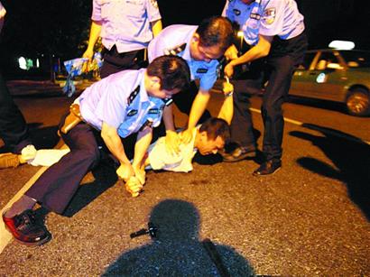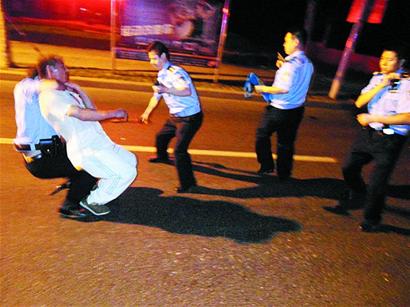 今晨2時05分 男子持菜刀砍向保安 今晨2時許,正在天虹花園小區南門口值班的保安老詹看到一名男子在大門口來回轉悠,行跡有些可疑,于是上前盤問。 “你干什么呢?”“我想干什么就干什么,再多嘴老子砍死你! ”老詹說,他沒有想到自己的一句話惹來對方如此暴怒,還未等他反應過來,對方就從隨身攜帶的一個包內掏出一把明晃晃的菜刀朝他頭上砍了下來。 “我當時沒看清他用什么砍的我,就下意識地用右手一擋,就感覺鉆心地疼,一看才發現是菜刀。”老詹說,自己的右手汩汩冒出鮮血,可對方仍然不放過,揮起菜刀再次朝他砍來。今年46歲的老詹,在市南區天虹花園小區當了許多年保安,這是敬業的他第一次遭遇生死一幕。 老詹見勢不妙,一邊逃跑一邊找地方躲避,在追趕了兩百多米后,這名手持菜刀的中年男子停了下來,先是罵罵咧咧了一陣,隨后提著菜刀離去。瞅準機會,老詹趕緊撥打110報警,并用對講機通知其余兩名同伴增援。由于擔心這名手持菜刀的男子跑掉或者再砍傷其他人,老詹一邊在后面悄悄尾隨,一邊隨時告知民警歹徒所處位置。 “他當時提著菜刀,沿著寧夏路朝 青島大學走去,一路上拿著菜刀亂揮舞。 ”老詹說,他當時最擔心的是歹徒持刀闖進大學校園, “校園里學生太多了,要是真闖進哪個宿舍后果不堪設想。 ”短短幾分鐘,一輛110警車火速趕到,在青島大學西門附近將手持菜刀的男子截停下來。此時,本報記者也第一時間趕至現場。 今晨2時25分 見記者拍照揮刀威脅 兩名民警從飛速趕到的110警車上下來后,沖著手持菜刀的男子喊話。 “有什么事情可以商量,趕快把刀先放下來! ”“我就是不放,有本事你們就上來! ”民警沖著他苦口婆心地勸說,可對方絲毫不為所動,仍然拿著菜刀到處揮舞。由于對方情緒過于激動,擔心強攻不成會傷及到路邊行人,兩名民警沒敢貿然沖上去。民警一邊設法與其周旋,一邊求援增派警力。隨后,金門路派出所的一輛警車在幾分鐘內也火速增援到現場。 4名民警站在七八米遠的地方與該男子展開了對話。記者在現場看到,手持菜刀的男子年紀在40歲左右,身高約1.75米,留著平頭,上身穿著一件白色襯衣,下身穿一條白色運動褲,腳蹬一雙灰色旅游鞋。雖然民警平心靜氣地勸說了十幾分鐘,但這個“菜刀男”卻絲毫沒有放棄抵抗的意思,仍然舉著菜刀到處亂跑,不時沖著民警比劃著,看到記者拍照時,還比劃著要朝記者扔菜刀,為避免意外,記者趕緊后撤幾步。 |