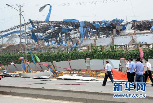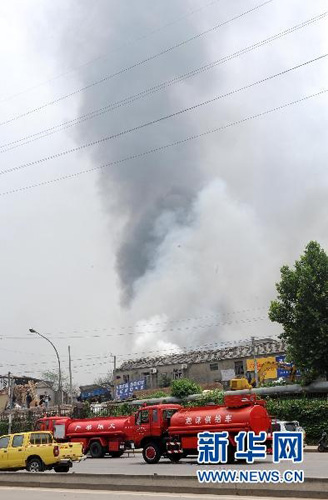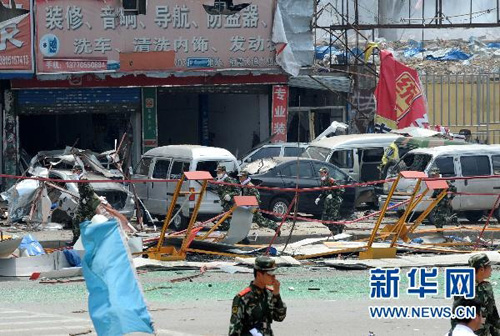 ?7月28日,爆炸現場附近的建筑物及公路施工圍擋被毀壞。新華社記者孫參攝