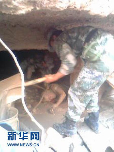 8月8日,蘭州軍區(qū)某集團軍防化團官兵正在現(xiàn)場實施救援。新華社發(fā) (王彥軍 攝)