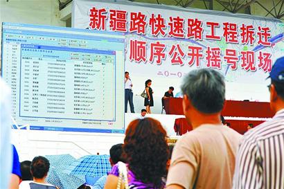 ????以往在我市的諸多拆遷項(xiàng)目中,都是使用按照交房順序先后依次發(fā)放選房順序號的方式來選房,而此次新疆路高架橋拆遷項(xiàng)目使用電腦搖號和現(xiàn)場依次發(fā)號兩種方式來選房,即選擇在7月24日至26日前三天交房的居民均具備同等的搖號選房機(jī)會,使用電腦搖號的方式隨機(jī)確定其選房順序號,而從7月27號起交房的居民將采取現(xiàn)場依次發(fā)號的方式來選房。