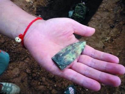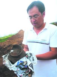 ????昨天,在膠州考古現場考古人員繼續對三座漢墓進行細致發掘時又有了重大發現,考古人員從兩座漢墓中發掘出了一個銅劍斷頭和一個黑陶罐。記者看到,在深埋地下2000多年后,這個斷銅劍頭依然鋒利無比。據考古人員分析,銅劍頭的出土,表明墓主人身份應該是這個古代家族中的一員武將,身份也較為顯赫。今天,考古人員將對剩下的古墓繼續進行發掘。