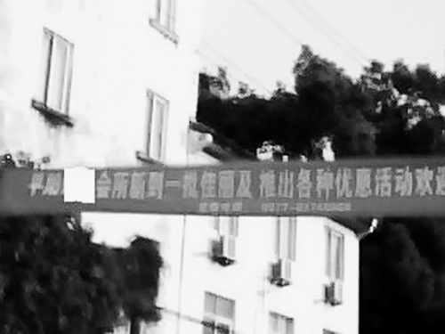 ????“旮旯人”發帖很簡單:一張比較模糊的照片顯示,橫幅掛在一幢黃色房子前面,也就大致能看出,上面寫著“平陽XX(照片處理過,遮去了名字)會所新到一批佳麗及推出各種優惠活動歡迎……”等字樣。