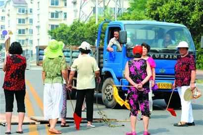 ????“我們從前天大清早就來到路上了,大家是鐵了心,不能讓這些大貨車再這么禍害下去了。”昨天下午記者到興城路附近小區,一名戴著遮陽帽的老太太告訴記者。記者在現場看到,20多名手持彩旗和樹枝的居民站在了馬路中間,行車道中間擺著破爛桌椅,只留下左右各一個車道讓小型車通過,這些居民見到過路的大貨車后就一擁而上,揮舞著小旗站在車頭前,讓司機趕快掉頭“另謀它路”。