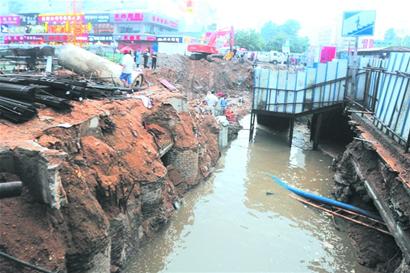 ????記者在地下通道北側(cè)入口看到,入口旁邊已被施工人員挖出一個(gè)大坑,坑內(nèi)滿是污水,大坑與地下通道北側(cè)入口間只有一些捆扎起來(lái)的鐵板圍擋,大水從圍擋縫隙向地下通道內(nèi)涌入。大坑一側(cè)停著一輛挖掘機(jī),旁邊還有一根斷裂的管道。商鋪老板們告訴記者,這段管道好像7月份就挖壞了,一直沒(méi)有修理,這次發(fā)大水可能與被挖壞的管道有關(guān)。