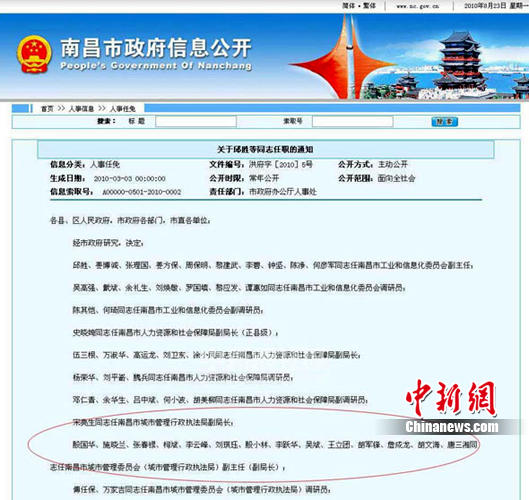 ????8月23日,中新網記者在南昌市政府信息公開網找到南昌市政府發布的洪府字[2010]5號文件,該文件名為“關于邱勝等同志任職的通知”(以下簡稱為“通知”)。通知顯示,南昌市政府任命了一批南昌市工業和信息化委員會、市人力資源和社會保障局、市城市管理委員會(城市管理行政執法局)以及市文化新聞出版局的官員。
