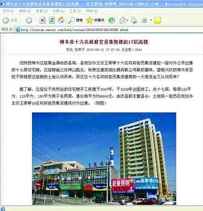 ????8月10日以來,一篇題為《神木縣十六名政府官員集資建起17層高樓》的帖子在很多網站流傳,網友直指神木縣規劃辦主任王榮等16名官員集資建樓并公開出售。