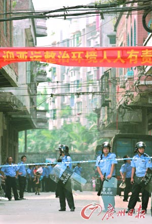 警察嚴(yán)陣以待,引得居民議論紛紛(駱昌威 攝)