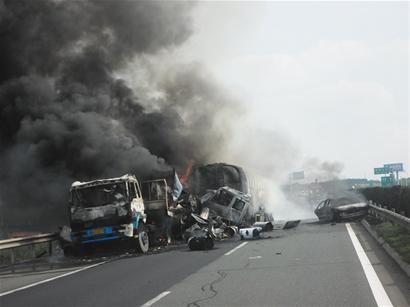 ????滿載30余噸催化劑的大罐車剎車失靈 昨天下午在同三高速上連撞兩輛轎車和一輛大貨車后起火 幸運的是事故只造成兩人受傷