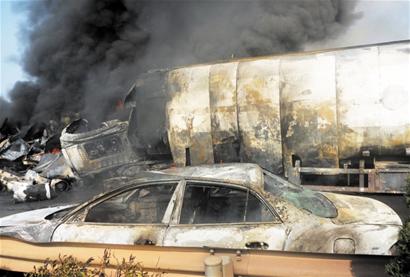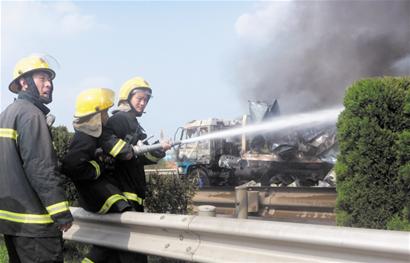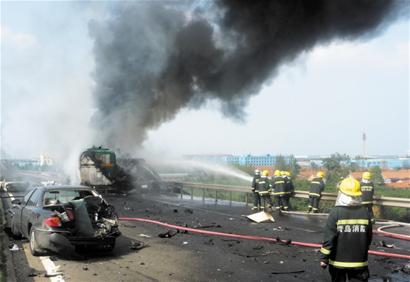 ????昨天下午2時許,同三高速公路膠州收費站北約300米處,一輛載著30余噸催化劑的大罐車,由南向北行駛時突然剎車失靈,接連撞上兩輛轎車后,又與一輛滿載家電的大貨車側面相撞,接連發出多聲炸響后,緊接著燃起了沖天大火,一輛轎車、罐車和大貨車被大火燒成空殼,經過消防隊員2個小時的緊急撲救終于將大火撲滅,所幸罐車沒有發生爆炸。事故造成罐車上兩名司乘人員受傷,目前正在醫院接受治療。