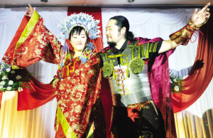????昨天上午,簡耀和遲道君的親戚朋友都趕到解放碑參加他倆的婚禮。同學趙先生一看到簡耀,卻愣住了,因為簡耀身穿的是三國時期大將軍的盔甲,意氣風發。